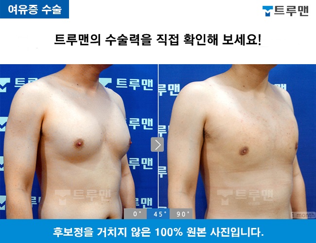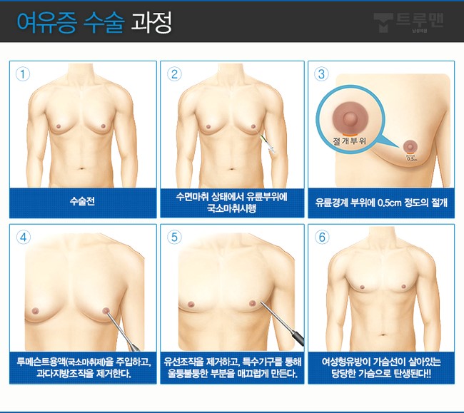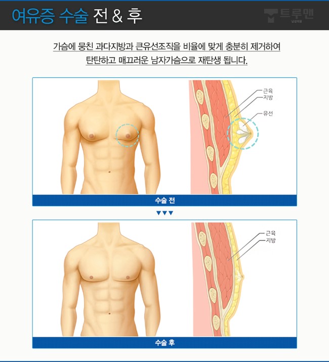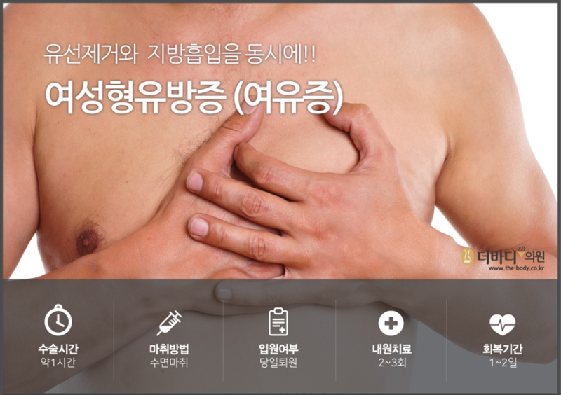 특히 여성형유방 증상이 있으신 분들은 가슴이 잘 발달되어 있을 경우 운동이나 식이요법으로 좋은 결과를 보기 어려우므로 지방의 분포와 가슴의 발달 정도를 확인한 후 수술을 진행해야 합니다.