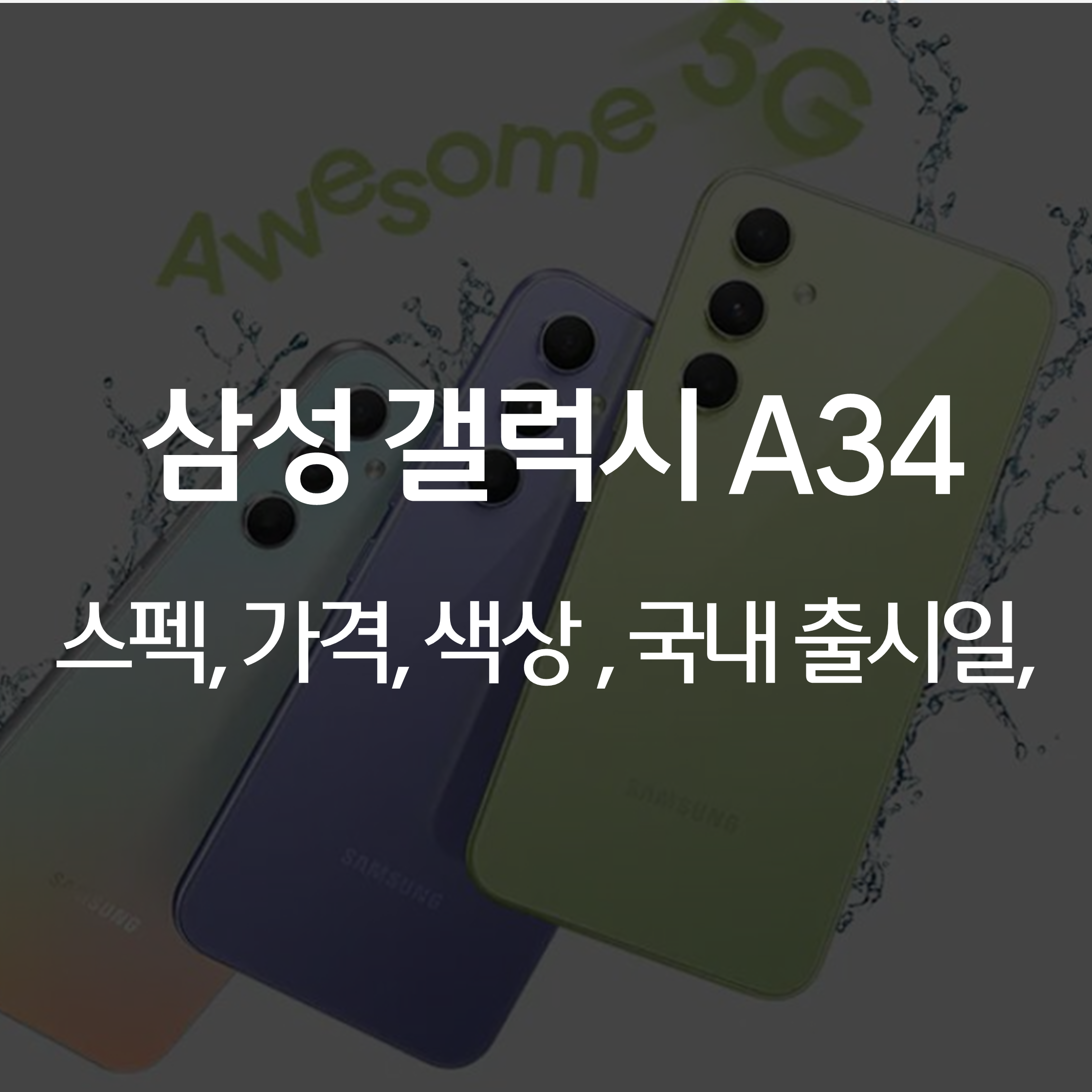 삼성 갤럭시 A34 5G 어썸 블랙, 어썸 화이트, 어썸 퍼플, 어썸 라임 4가지 색상으로 구성되어 있습니다.