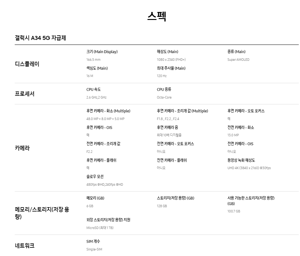 1. 갤럭시 A34 5G 사양