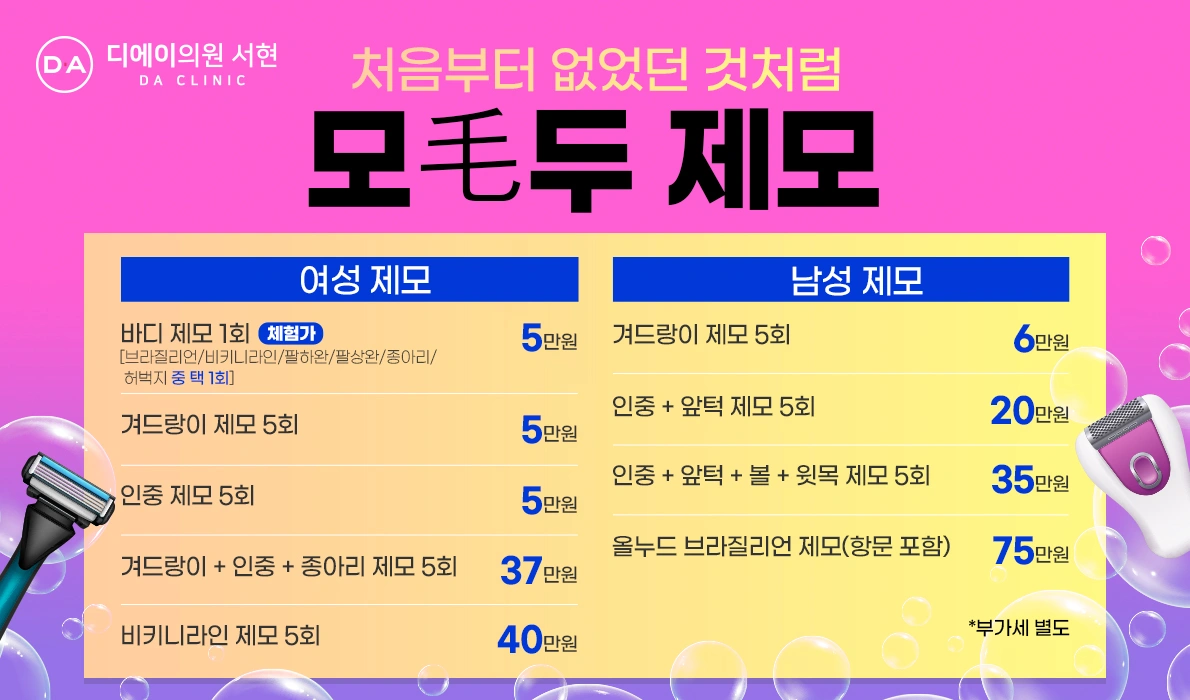 서현에는 피부과와 진료소가 많아 진료소의 시설과 위생상태를 꼼꼼히 확인하는 것이 중요하다. 특히, 레이저 제모는 피부에 직접 닿는 시술이기 때문에 위생 관리가 제대로 이루어지지 않을 경우 트러블이나 감염의 위험이 있을 수 있습니다. 병원 방문 시 체크리스트 시술 도구(특히 시술 시 주의사항)를 확인하세요. 냉각 젤)은 일회용입니다. 대기실부터 시술실까지, 진료실이 깨끗하게 유지되고 있는지 살펴보세요. 병원에서 레이저 장비를 사용하는 경우 장비를 정기적으로 검사하는지 문의하세요. 4. 가격만 보지 말고 시술 횟수와 관리 프로그램을 비교해 보세요.