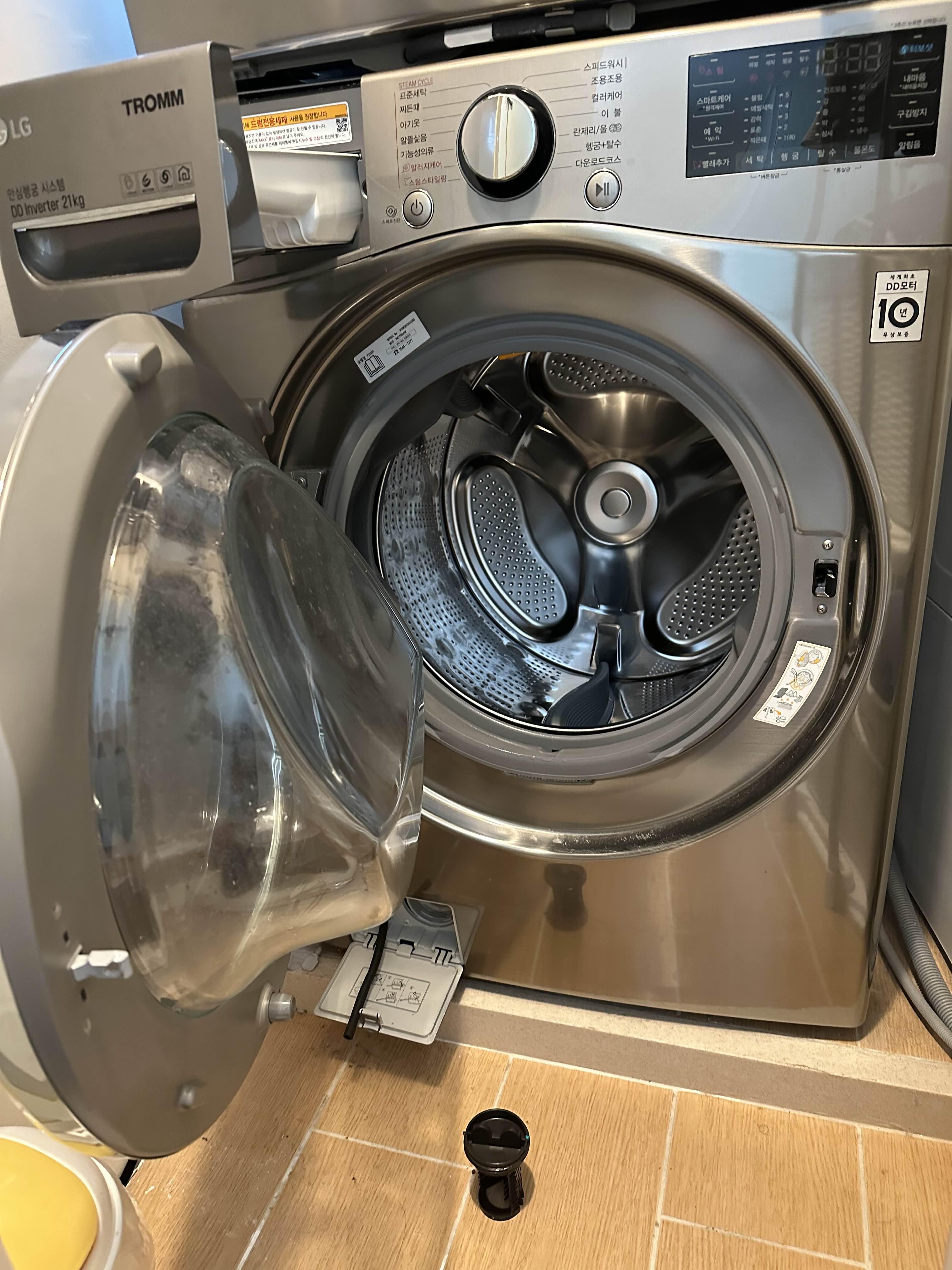 제 세탁기는 LG 제품인데 저번에 사용한 삼성 세탁기는 왼쪽 하단 구석에 있는 세탁조를 그대로 비울 수 있었습니다.