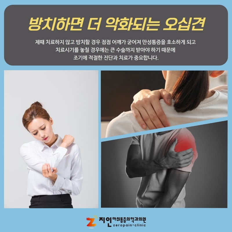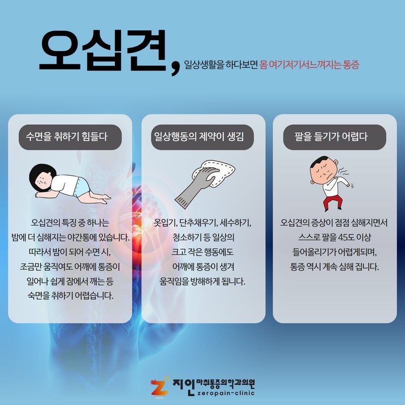 오십견 증상 : 팔을 90도 이상 올리기 어렵고 팔뚝과 손이 저리며 어깨 통증이 동반된다. 어깨 통증은 쉽게 말해 어깨 주변 조직이 뻣뻣해지면서 근육 경련이 일어나 옷을 갈아입고 벗고 세수하고 머리를 감는 등의 일상적인 활동이 어려울 정도로 심한 통증이다. 통증, 특히 심한 통증은 잠을 자기 어렵게 만들 수 있습니다. 이러한 증상이 반복되면 악화되기 전에 가능한 한 빨리 치료를 받는 것이 가장 좋습니다. 만족스러운 오십견 치료효과를 기대한다면? 그렇다면 오십견 환자들이 빠른 치료와 완전한 회복을 위해 주의해야 할 점은 무엇일까? 관절낭의 유착 정도와 염증으로 인한 어깨 관절의 운동 범위는 환자마다 다르므로 정확한 진단 후 그에 맞는 치료를 진행해야 합니다. 치료가 단계별로 충족되지 않으면 기대하는 치료 효과를 얻기 어렵기 때문에 오십견을 완치하거나 빠른 회복을 위해서는 적절한 치료가 이루어졌는지, 어떤 직업군이 맞는지 면밀히 따져볼 필요가 있다. 의료진의 치료를 받기 전과 같습니다. #头痛治疗 증상을 무시하고 치료 시기를 놓치면 어깨 관절의 움직임이 제한될 수 있어 병원 의료진의 정확한 진단과 치료가 필요하다. 또한 조기에 발견하면 비수술적 치료만으로도 증상이 호전될 수 있습니다. 소염진통제 치료 외에도 주사요법, 관절가동범위를 늘리는 운동요법, 체외충격파요법 등 보존적 치료를 통해 통증을 충분히 줄이고 기능을 향상시킬 수 있다. 체외충격파 요법은 세포를 활성화시켜 염증을 감소시킨다. 그 중 어깨 통증 치료에 흔히 사용되는 체외충격파는 염증과 통증을 감소시키면서 효과적으로 기능을 회복시킬 수 있다. 세포, 염증을 줄이고 주변 조직을 재생합니다. 이 치료법은 노화된 힘줄, 인대 등 주변 조직에 좋은 에너지를 공급해 치료 효과를 높이고, 치료 시간이 짧아 바쁜 직장인이나 고령 환자에게도 부담의 위험이 없고 누구나 쉽게 받아 들일 수 있다. 그러나 적절한 보존적 치료 후에도 여전히 유의미한 호전이 없다면 관절경 등의 수술을 고려해야 한다.