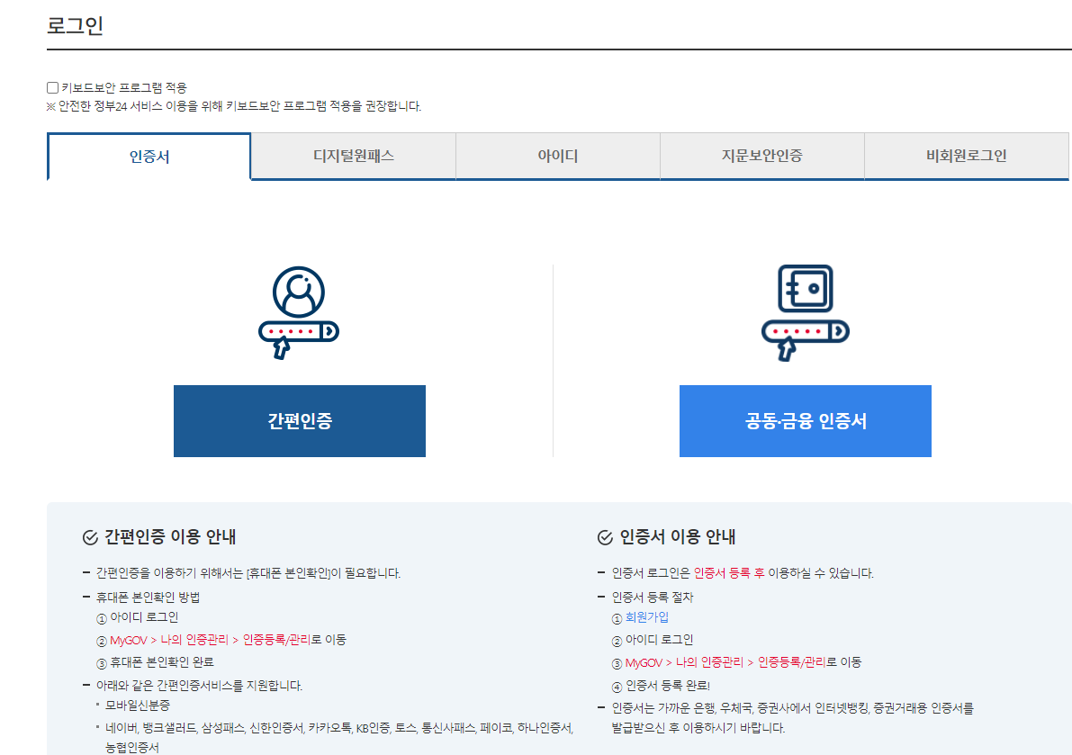로그인 방법은 간단한 인증으로 위 사진과 같이 다양한 사이트를 이용하여 로그인이 가능하며, 공동/금융 증명서도 가능하므로 사전에 준비하여 로그인하는 것을 권장합니다.