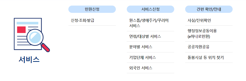먼저 가장 많이 이용하는 서비스 창구로는 민원신청, 서비스신청, 간편확인/안내가 있습니다.