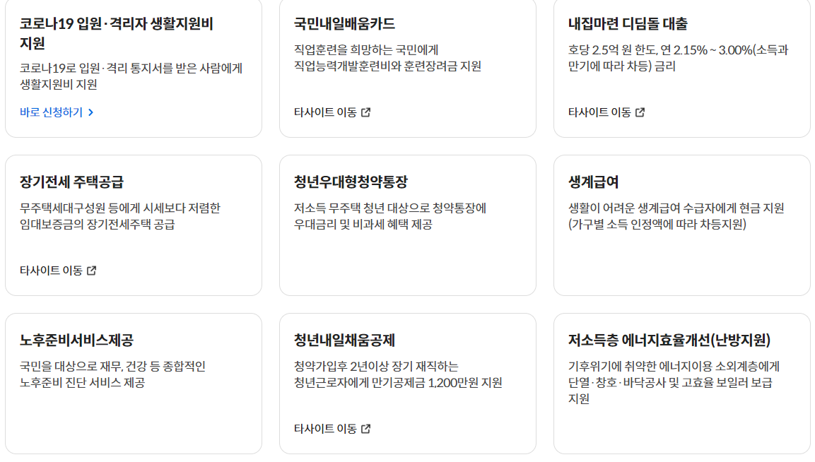 보조금24의 경우 코로나 관련 지원, 취업, 주택소유, 치매, 출산, 내일배움카드와 관련된 각종 보조금을 보고 신청할 수 있다.
